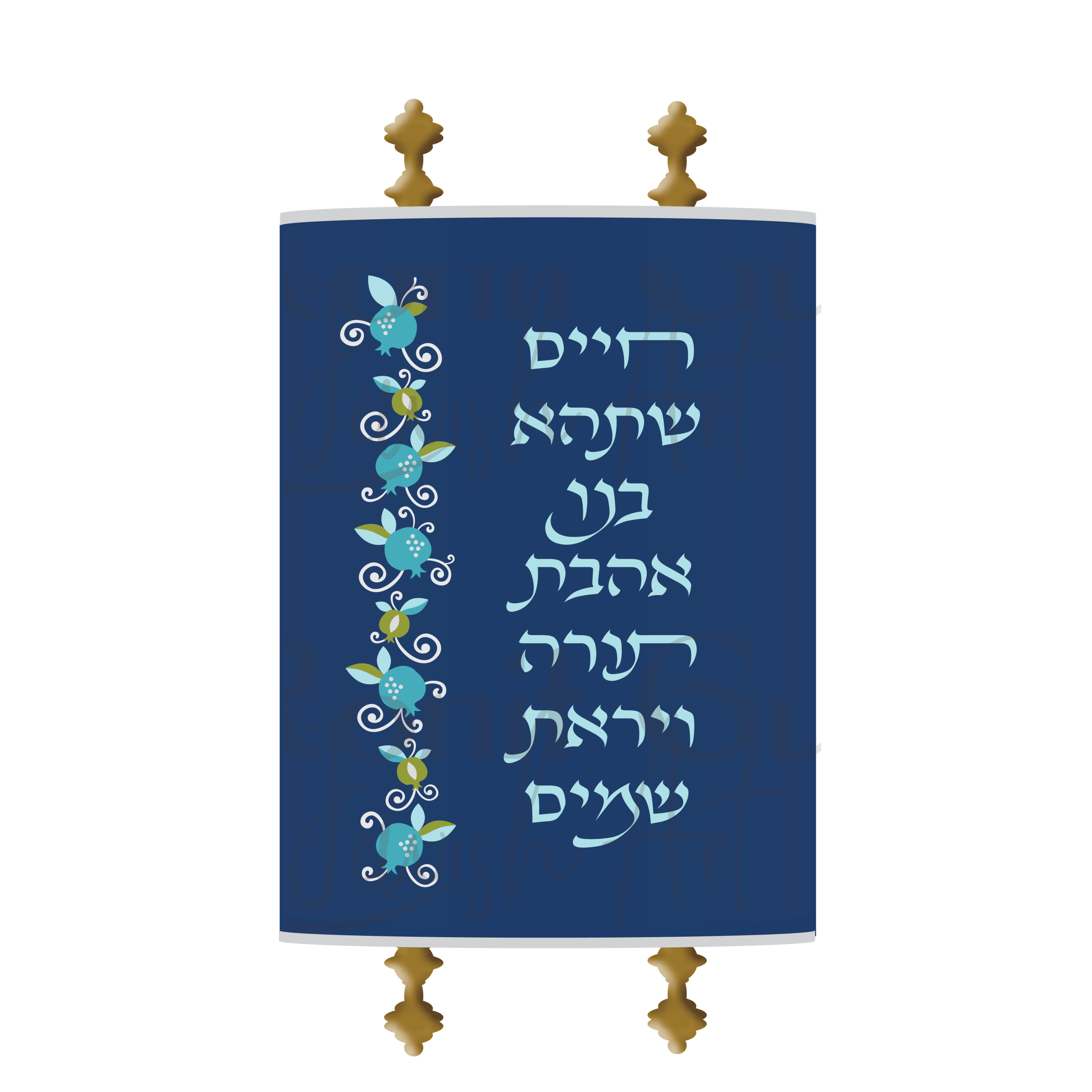 מעיל לספר תורה של המעצבת רונית גור. המעיל מעוטר ברקמה היוצרת רימונים צד בגווני וירוק כחול על רקע כחול ופסוק, בעיצוב חדשני ומודרני.