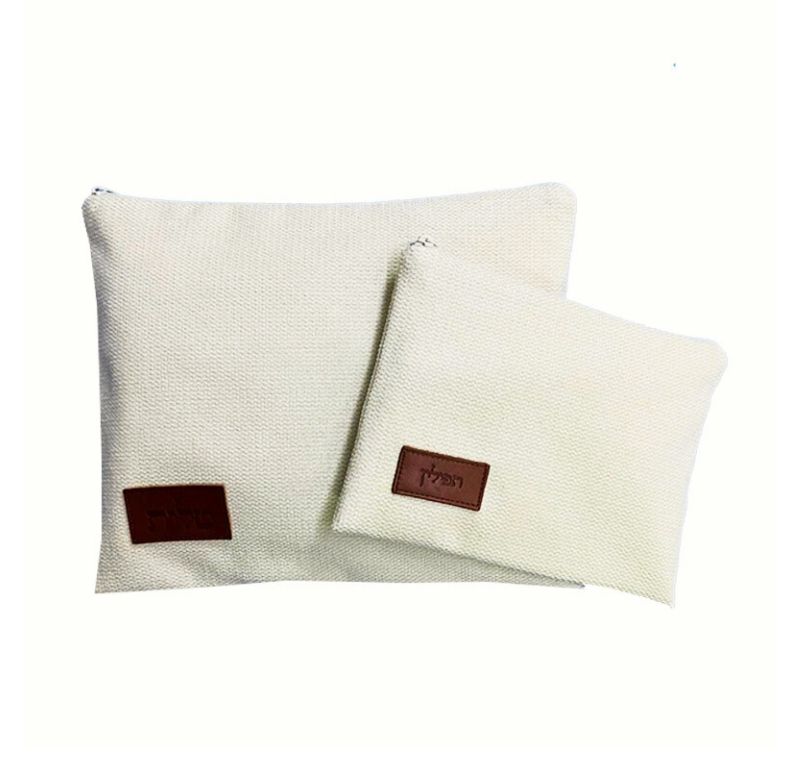 סט תיקי טלית ותפילין שמנת בהיר תבלט עור