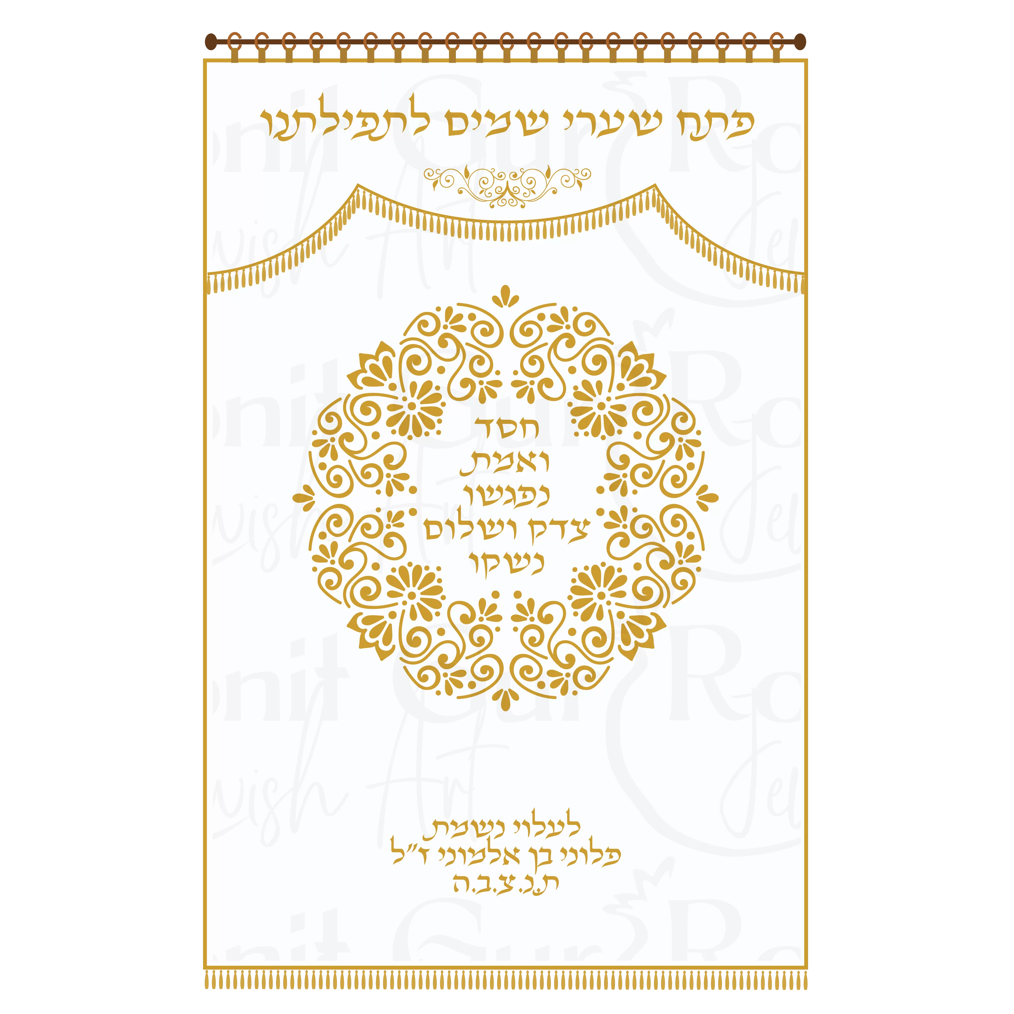 פרוכת לארון קודש של המעצבת רונית גור. הפרוכות מעוטרת בדוגמת מנדלה בתוספת כפורת, הפסוק, ניתן לשינוי על פי בחירת הלקוח . ניתן לבחור בין בד קטיפה למראה קלאסי או בד ארוג למראה מיוחד. כל הבדים ברמת איכות גבוה מאוד. ניתן לבחור את צורת התלייה- טבעות על מוט או ווים לתלייה על מסילה. ניתן לרקום הקדשה בתוספת תשלום. המוצר נתפר באיכות ובגימור גבוהים מאוד. מיוצר בישראל!