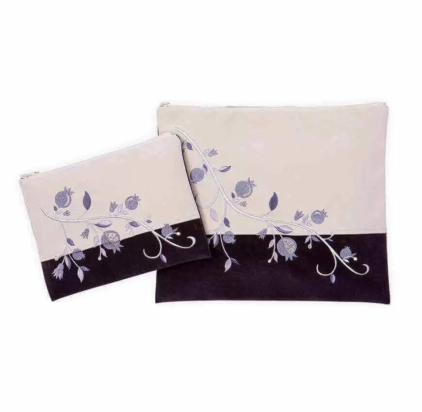 כיסוי לטלית ותפילין דגם רימונים מבד קלינטקס איכותי משולב אפור ואופוויט מעוטר ברקמת רימונים בגווני אפור של המעצבת רונית גור. הסט מגיע עם נילון קשיח לשמירה מקסימלית. המוצר נתפר באיכות ובגימור גבוהים מאוד. מיוצר בישראל!